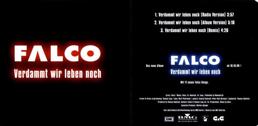 Seit ein paar Tagen gibt es die Single Verdammt wir leben noch im Handel (etwa bei Libro oder Amazon.de). Bei Falco Calling kann man in das Lied reinhören, dank einem .mp3 Preview!!! (Ausschnitt, 26 Sek., 56 kbps, 22.000 kHz, 187 KB).