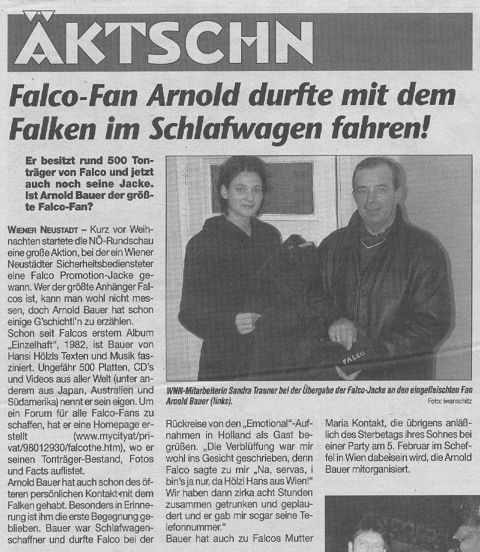 | Außerdem möchte ich auch endlich (mit einiger Verpspätung) auf unseren geschätzten Arno(ld *g*) aufmerksam machen, der im Januar bei einer Aktion der NÖ-Rundschau eine Falco Promotion-Jacke gewonnen hat und damit sogar in die Zeitung kam!