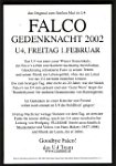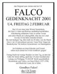 Tribute - EventsSeit 1999 finden in jedem Jahr um den 6. oder auch 19. Februar herum Falco-Gedenk-Feste in Wien statt. Hier ein paar Berichte und Bilder: Weitere Berichte und Fotos könnt ihr auf diesen Seiten ansehen: Hier noch Flyer von Tributes, von denen es keinen Bericht auf Falcoworld.net gibt: |